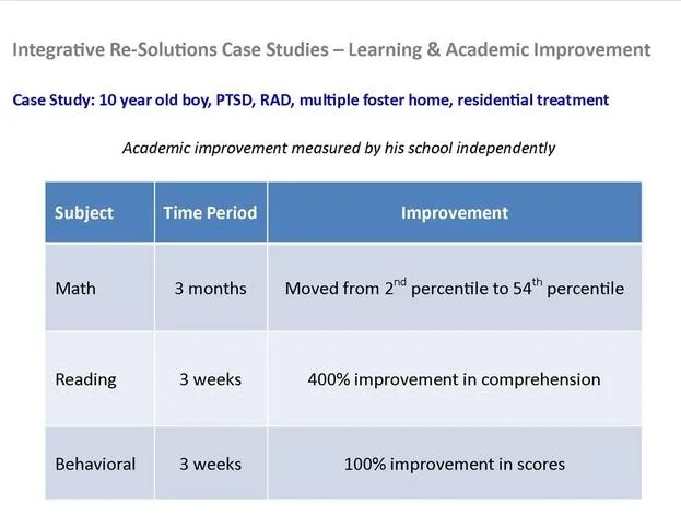 Integrative Re-Solutions teaches and helps the brain master these skills and the processes underlying learning. Integrative Re-Solutions bypasses the conscious mind and directly “trains” the brain to functional fluidity. As the brain becomes more competent and effective, physical and emotional symptoms resolve and learning is enhanced.